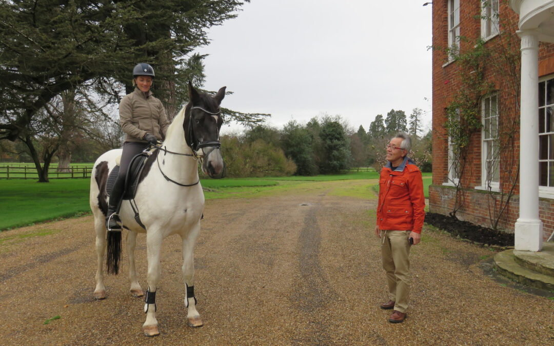 Jo Marshall riding Suds at Fordham Abbey with Mr. Yoshihide Hashimoto, the owner of the Abbey and Dojima Sake Brewery